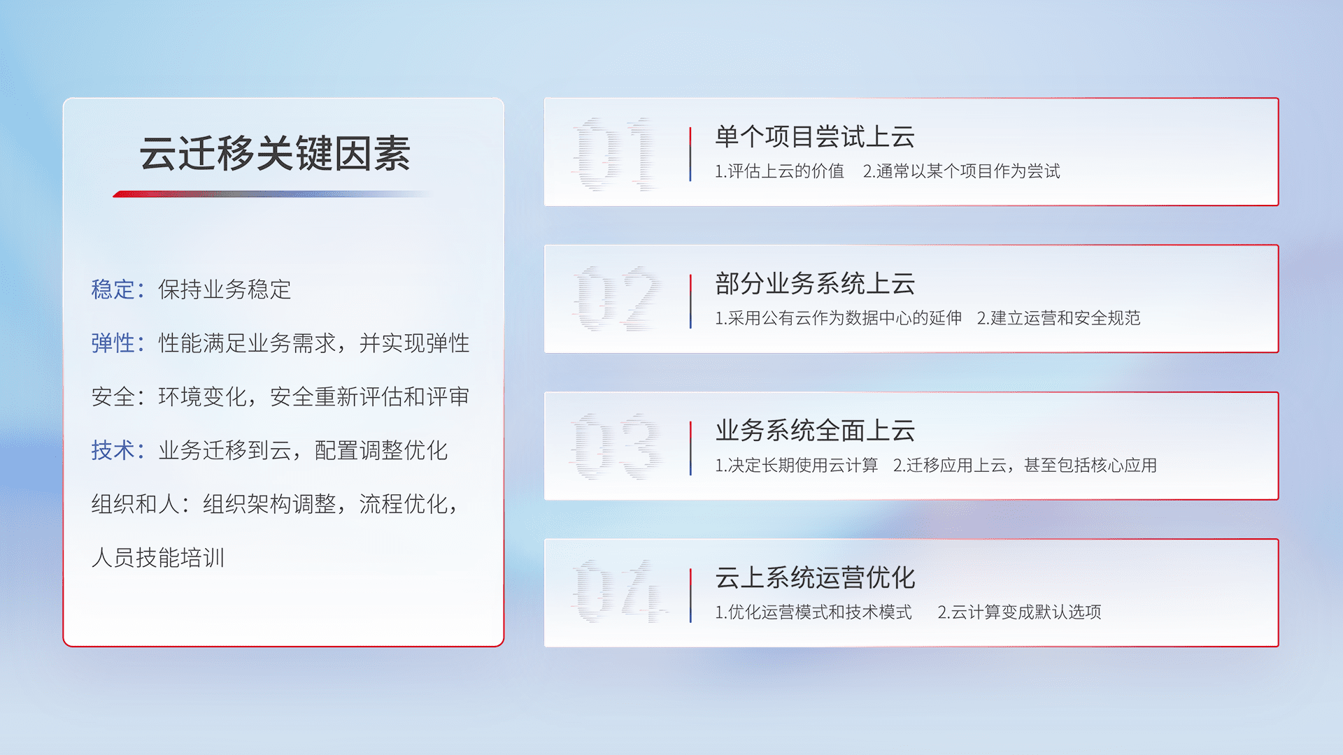 结合实际业务,,,从规划设计、、、云平台选型、、云原生改造、、数据迁移、、、、集成交付,,迁移全过程为客户识别最佳上云路径,,,做好风险识别管理,,,设计网络架构、、、、身份权限、、安全审计合规、、操作审计、、日志审计、、、监控告警策略、、、、多站点容灾设计等,,对云上基础设施进行整体规划,,提升IT治理水平,,,以满足弹性、、、高可用、、高性能的需求。。