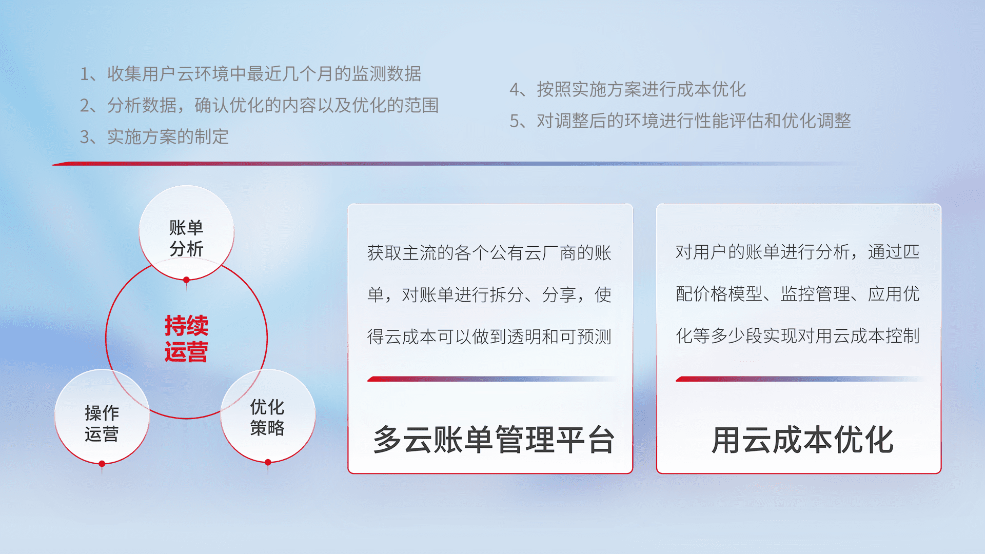 通过多云纳管,,,,以统一的资源数据模型把客户的云资源进行抽象和封装,,,进而实现对多云资源的统一操作,,,保障云资源管理的可靠性、、、稳定性与可用性。。量身定制化运维内容,,,,配置、、、、开发运维、、、补丁管理、、、备份、、、、监控、、、、认证和访问管理、、、、审计和日常巡检等,,保障在用云过程中的可靠度,,,,稳定度以及高可用率。。